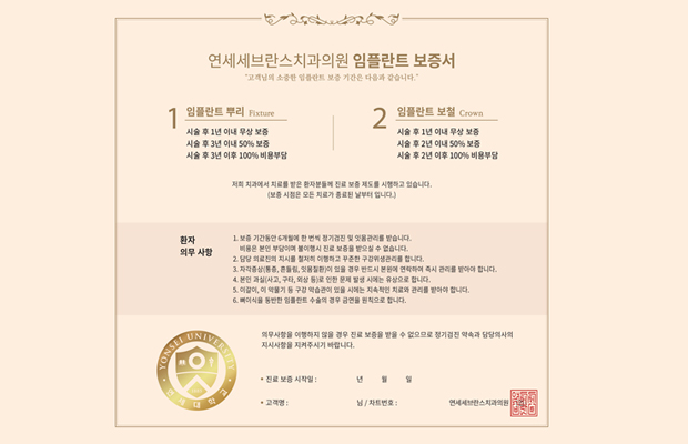 임플란트 진료 보증 시스템은 저희 의료진이 환자분께 드리는 약속이자, 최고의 진료 품질에 대한 강한 자신감의 표현입니다. 여러분의 건강한 미소, 저희가 끝까지 함께하겠습니다.